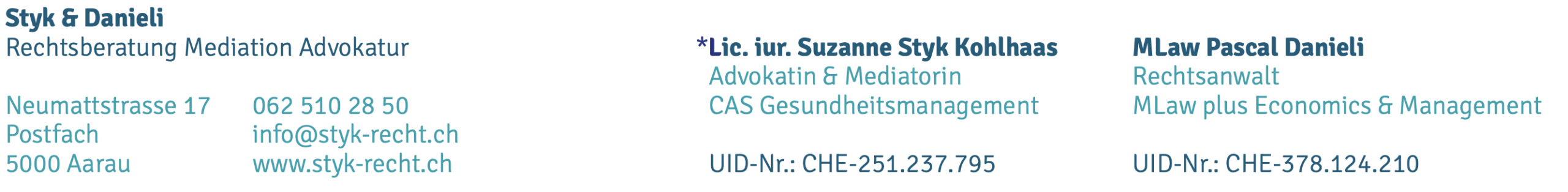 Styk & Danieli – Rechtsberatung, Mediation & Advokatur stellt keine eigene juristische Person dar. Die unter dieser Bezeichnung tätigen Rechtsanwältinnen und Rechtsanwälte üben ihre Tätigkeit jeweils als rechtlich selbständige Einzelunternehmen aus. Der Mandatsvertrag kommt ausschliesslich mit derjenigen Anwältin bzw. demjenigen Anwalt zustande, welche(r) das Mandat übernimmt, namentlich Suzanne Styk Kohlhaas oder Pascal Danieli. Eine gemeinsame oder solidarische Haftung besteht nicht.